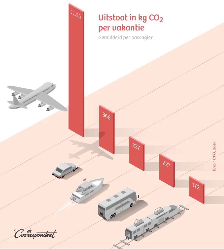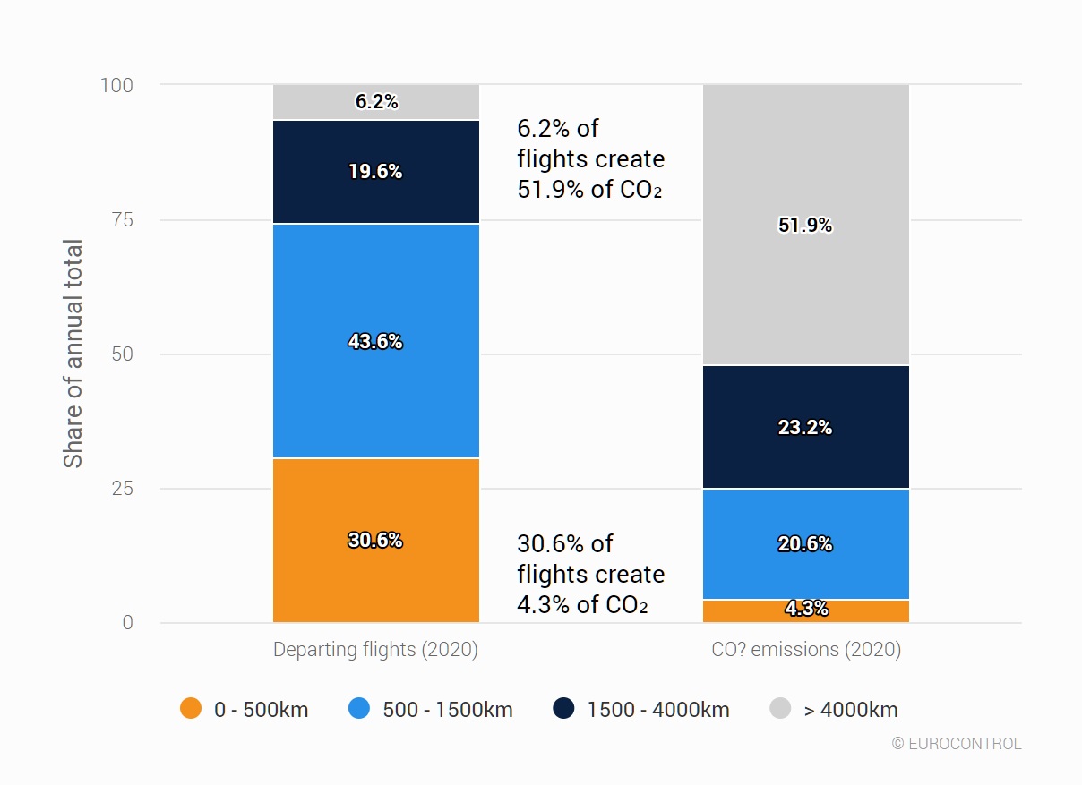 Driekwart van de uitstoot wordt veroorzaakt door 25% van de vluchten op verderweg gelegen bestemmingen. Dertig procent door korte vluchten die veelal ook door de trein worden bediend.