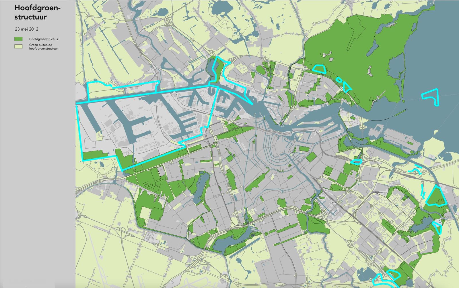 De scheggen overlappen de Hoofdgroenstructuur. Het manifest benadrukt de unieke natuur in en om Amsterdam waardoor alle burgers binnen 10 minuten fietsen een groengebied kunnen bereiken.